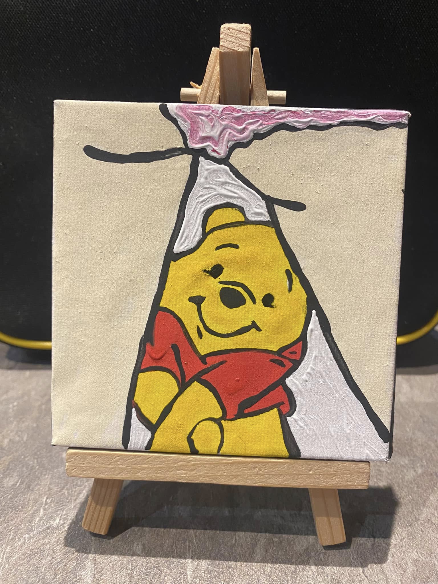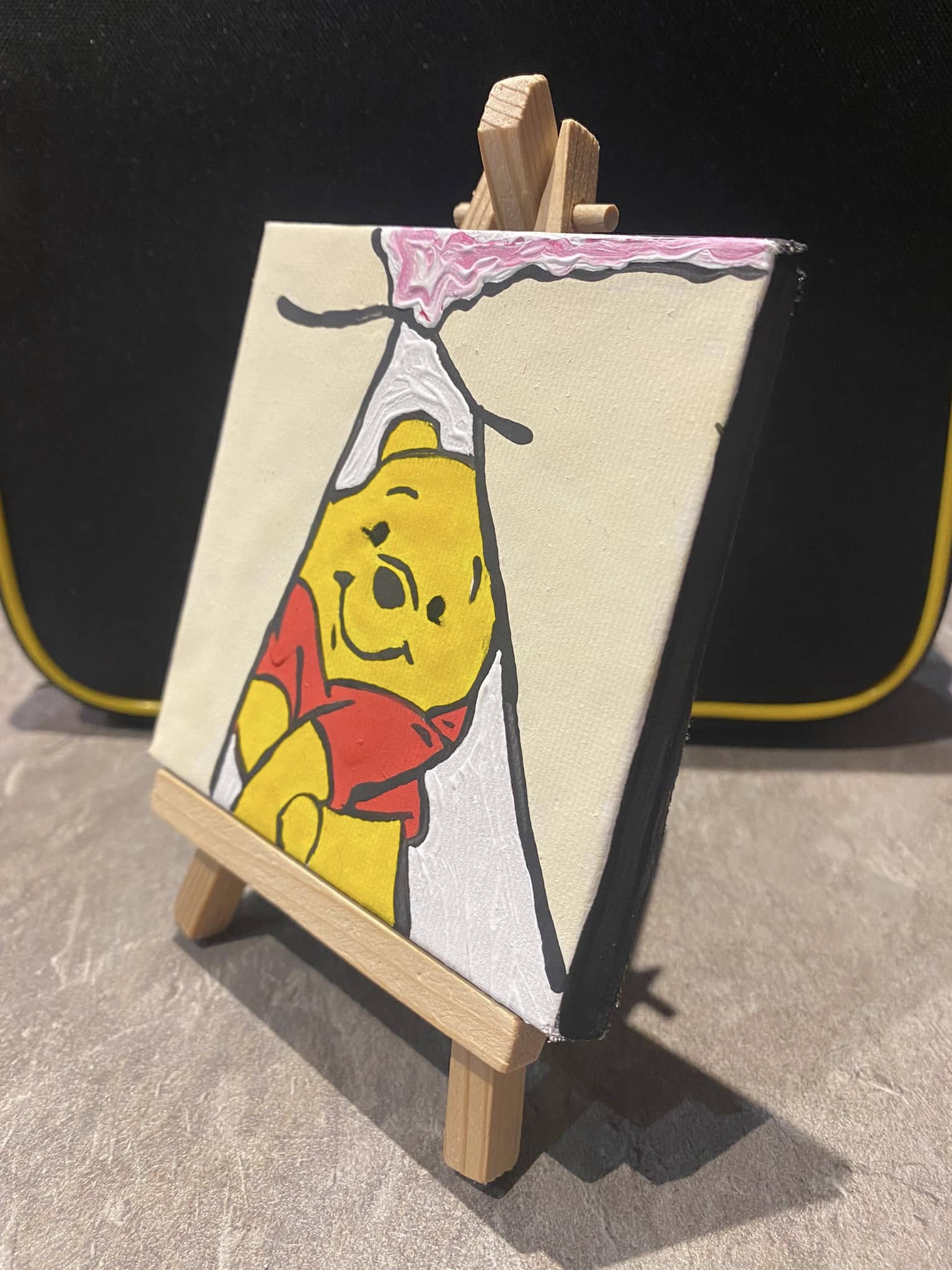 Bring a touch of whimsy and humour to your space with this unique, hand painted winnie the pooh canvas! Crafted with love using acrylic paints, this charming piece measures 10cm x 10cm and comes with an easel stand, bringing the total height to 15cm.